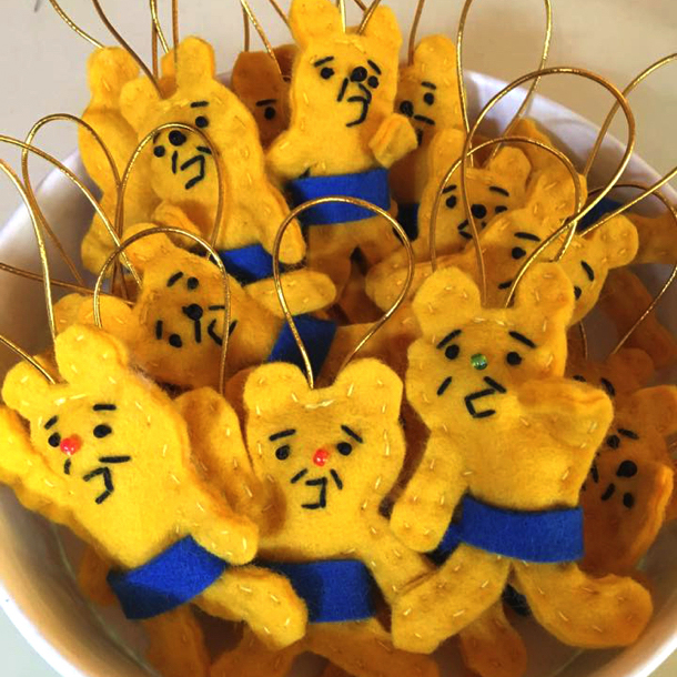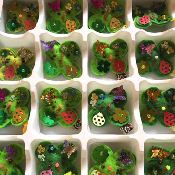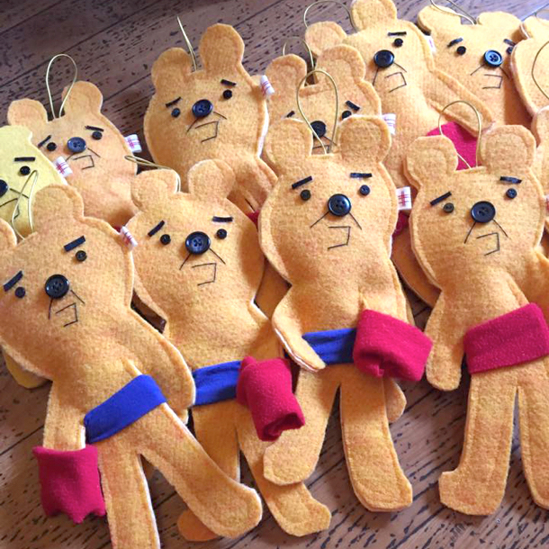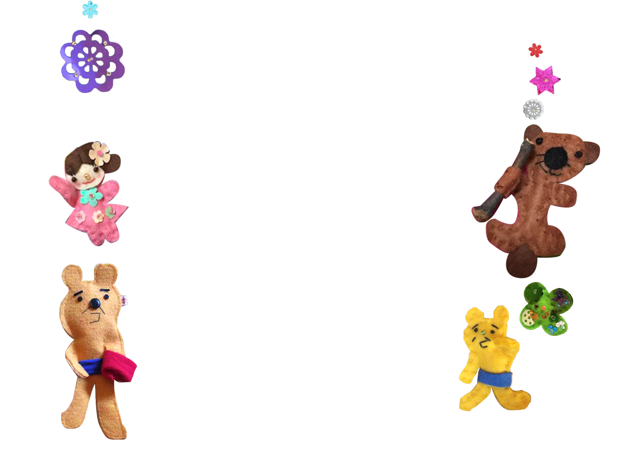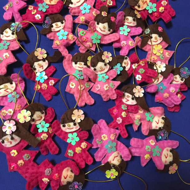 フェルトや、スパンコール、ビーズ、針と糸を使う