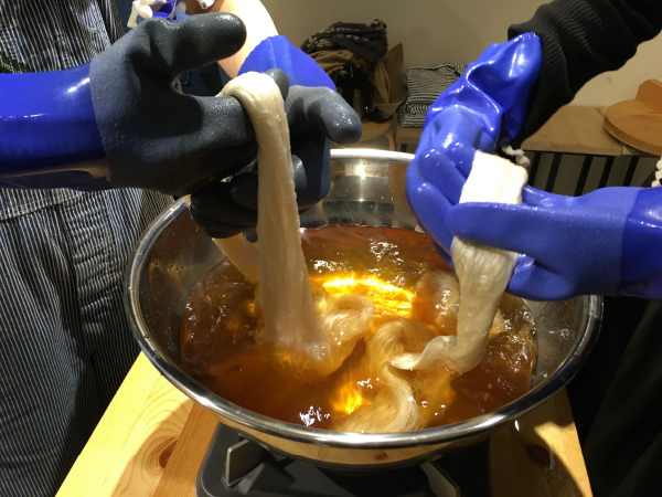 ▲絹糸を染めているところ。うすく色が乗り移っています。