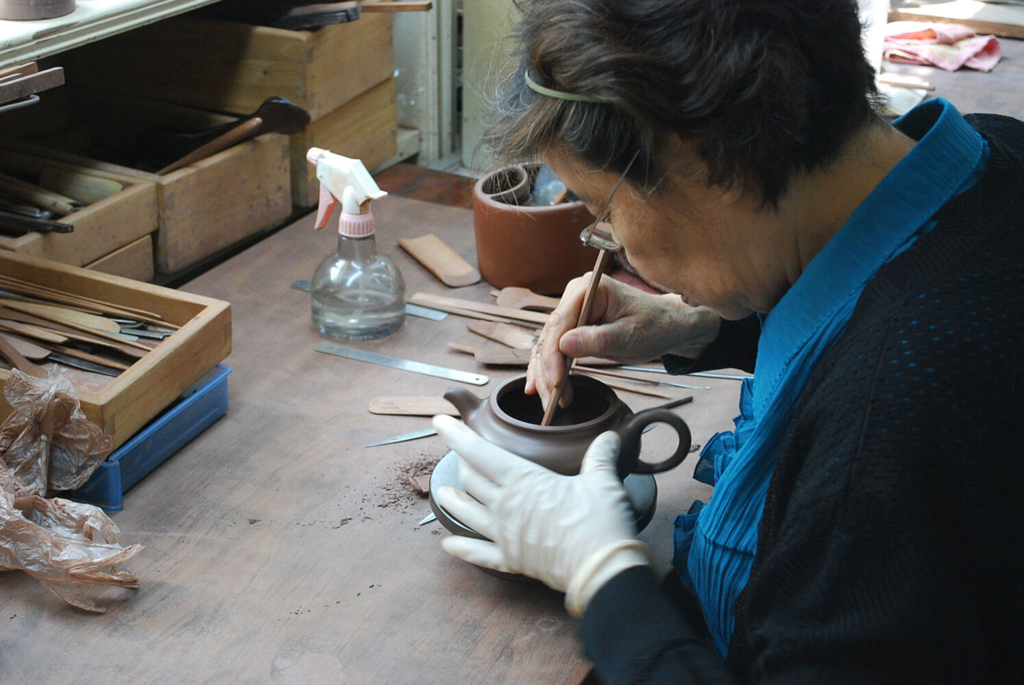 時間がある時には、夫が土の塊を持って来て、いじったり、図面を描いたりしてましたから、それを見て「あ、これ面白そうだから作ってみようか」とか、そういうこともありましたし、自分も修業のために名人の急須を真似して作ってたんです。陳寿珍さんていう人のをよく作ってたんですよ。