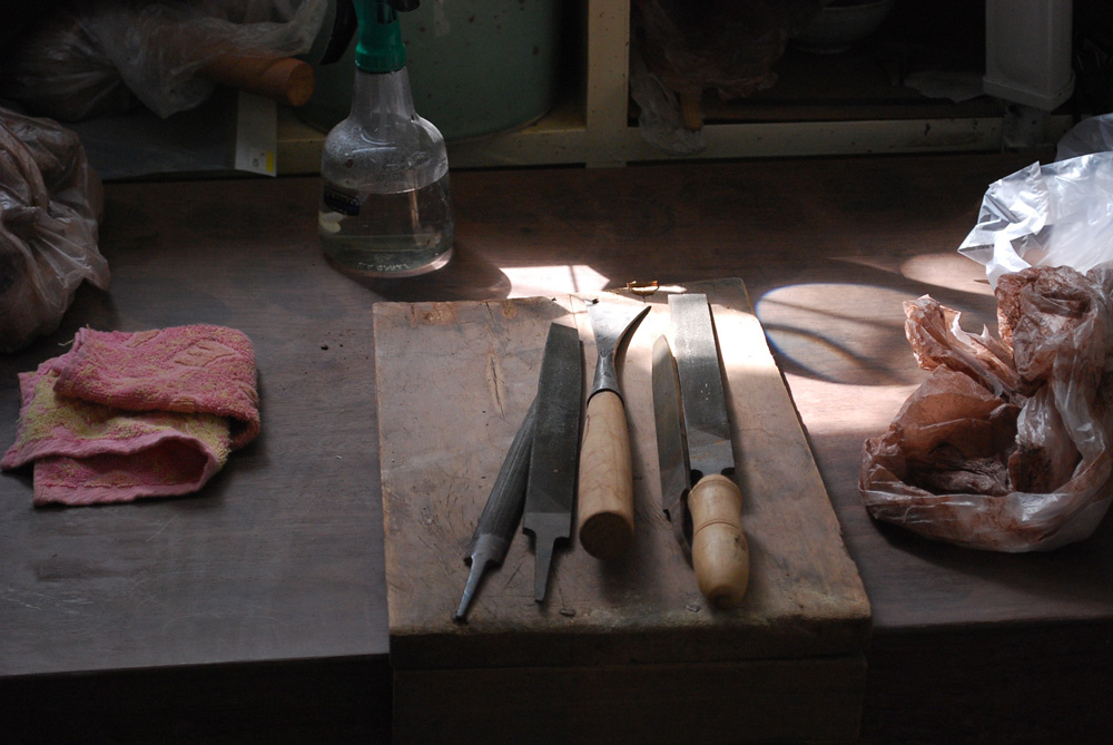 材料は、大きさや形はさまざまでしたが、10×30×40センチぐらいのレンガ状の形で来ます。三つの班の仕事は、「材料作成」「成形工場」「窯務」です。成形の中に、形を作る私達の仕事と、絵や文字を彫り込む作業がありました。